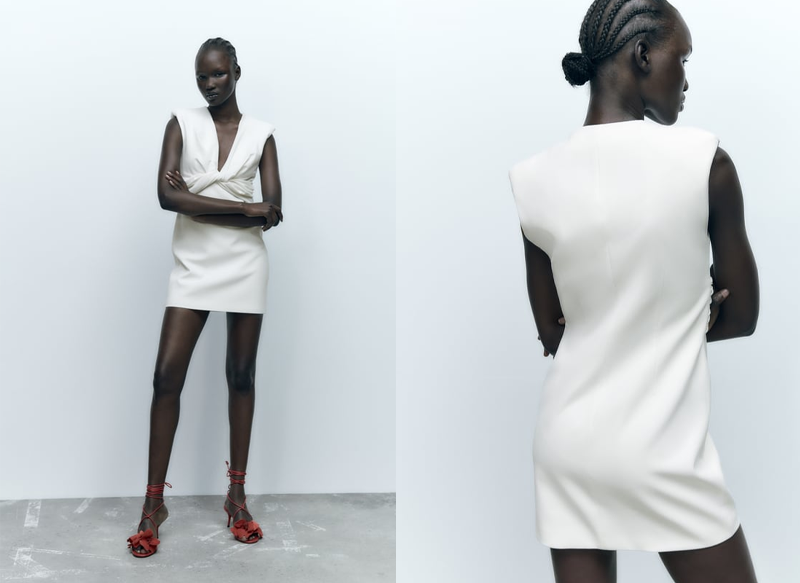 En Zara es posible encontrar prendas de ropa para todos los gustos. Entre sus novedades hay que destacar este vestido corto hombreras, modelo confeccionado en poliéster, viscosa y elastano que se vende por 59,95 euros.