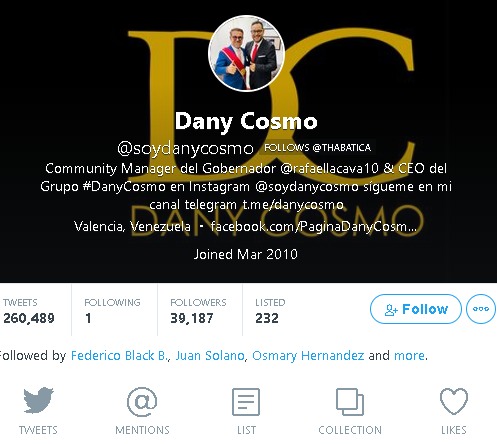 En días pasados el CM de Lacava, Daniel Cosmo, ha decidido iniciar su plan de intimidación, utilizando su cuenta de Twitter, con la cual no sigue a absolutamente nadie, para seguir a periodistas y posteriormente retirarle el seguimiento, como parte de su estrategia para advertir que desde la oficina que gestiona las comunicaciones del gobernador están muy atentos a las informaciones que se han publicado en Moncloa.com.