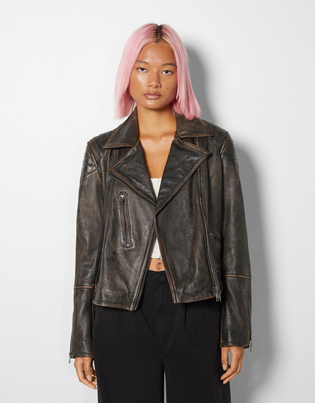 Otra de las grandes opciones vintage que puedes encontrar en el catálogo de Bershka es esta cazadora estilo biker con exterior de 100% piel ovina disponible en cuatro tallas por un precio de 89,99 euros. Es, sin duda, la prenda perfecta para los amantes de lo retro y lo vintage gracias a su efecto de piel desgastada que le da un toque antiguo. Lo mejor es que puedes combinarla con cualquier cosa, desde unos vaqueros hasta un vestido de fiesta.