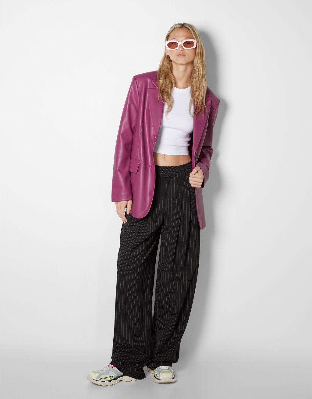 Sin duda, una de las prendas más bonitas que vas a encontrar en la colección de otoño invierno de Bershka es esta blazer oversize efecto piel. Este tipo de prendas con tejido efecto cuero se puso muy de moda hace unos años, aunque solían encontrarse únicamente en negro. No es el caso de esta que, aunque puedes encontrarla en negro, también está disponible en color mostaza y en este originar color rosa tirando a vino que, sin lugar a dudas, le va a dar un toque original y divertido a cualquier look. Puedes encontrarla en cuatro tallas diferentes y su precio es de 35,99 euros.