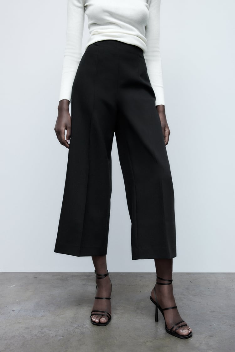 Para las más clásicas, Zara propone este pantalón culotte de tiro alto confeccionado con tejido en mezcla de viscosa, detalle de costuras marcadas, pierna ancha y cierre lateral con cremallera en la costura. Gracias a su corte elegante y a su intenso color negro, son una de las prendas más elegantes que vas a encontrar. Lo mejor es que combinan con prácticamente todo lo que te imaginas y, junto a unos buenos tacones, conseguirás unas piernas largas y estilizadas. Su precio es de 29,95 euros.