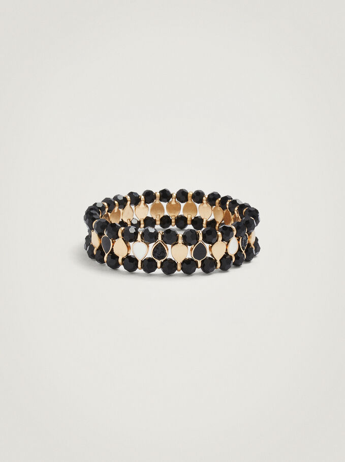Otra pulsera elegante y muy decorativa es este diseño elástico de Parfois. Es una pulsera ancha, estilo brazalete, compuesta de tres filas de cuentas y piedras, combinando el color negro, el dorado y en perla. El resultado es una pulsera preciosa para lucir en ocasiones especiales. Porque el estilo no está reñido con un precio económico. Puede ser tuya por 8,99€.