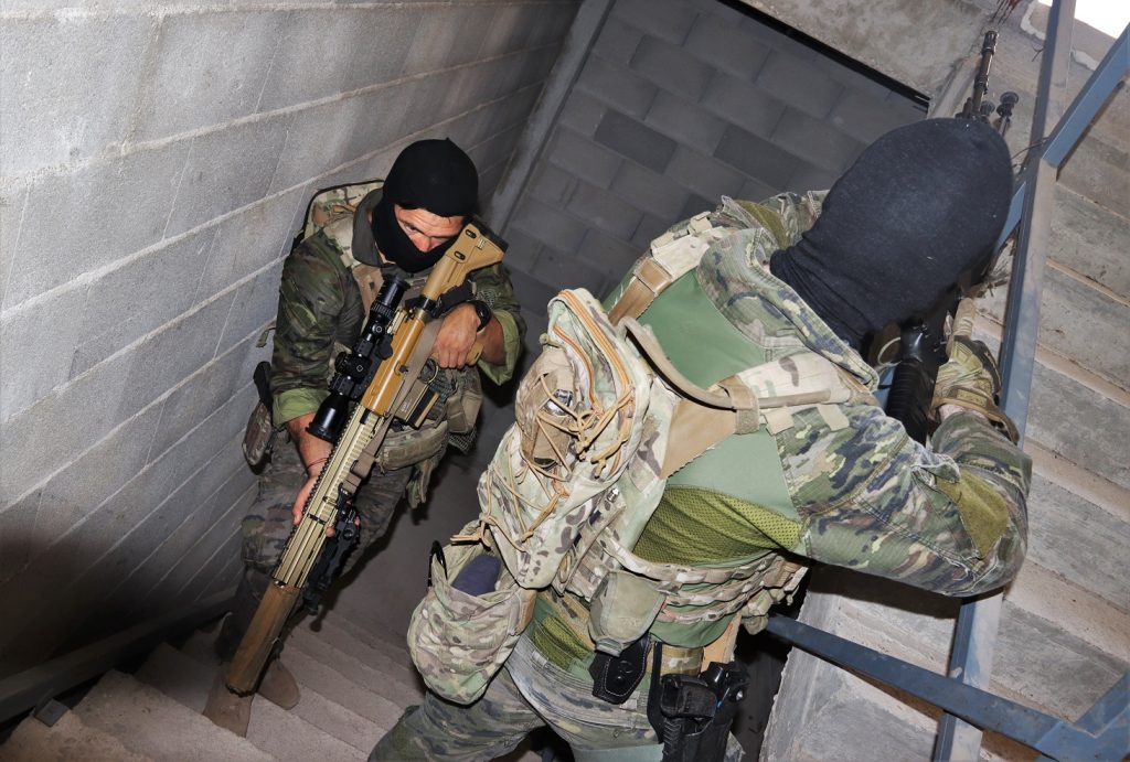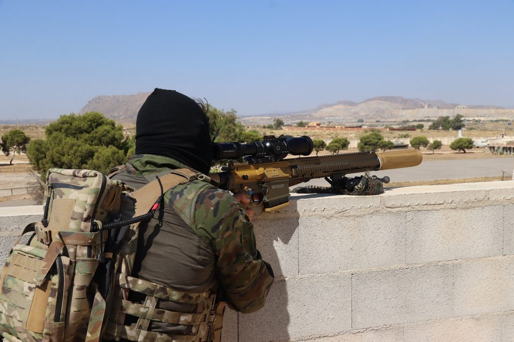 Allí, los profesionales del MOE, en concreto de su Bandera de Operaciones Especiales «C.L. Maderal Oleaga» XIX, además de mostrarnos el nuevo fusil de precisión, nos explicaron que el concepto de uso del G28 es el de su empleo por los tiradores selectos que se encuadran en los referidos EOs. Esta definición se enmarcaría internacionalmente en la categoría de tirador designado o Designated Marksman Rifle (DMR), que llena el vacío entre los integrantes de los EO y los citados Equipos de Tiradores de Precisión Pesados y Ligeros. Estos últimos, en el caso del MOE, cuentan también con un buen material que va desde las pesadas pero devastadoras armas contra material norteamericanas Barrett M95 de 12,70 mm y los británicos Accuracy International Arctic Warfare Magnum (AWM) de calibre .338 Lapua Magnum (que equivaldría a un calibre de 8,6×70 mm) y su “hermano menor”: el fusil Arctic Warfare (AW), que dispara el citado cartucho de 7,62×51.