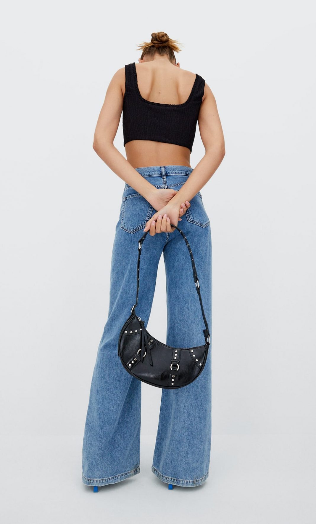 Otra de las bandoleras que no pueden faltar en tu armario y que ya están disponibles en la sección de novedades de Stradivarius es esta. Llama la atención por su diseño de media luna, su intenso color negro y sus detalles de tachas. Ideal para construir un look rockero, la puedes conseguir por solo 19,99 euros.