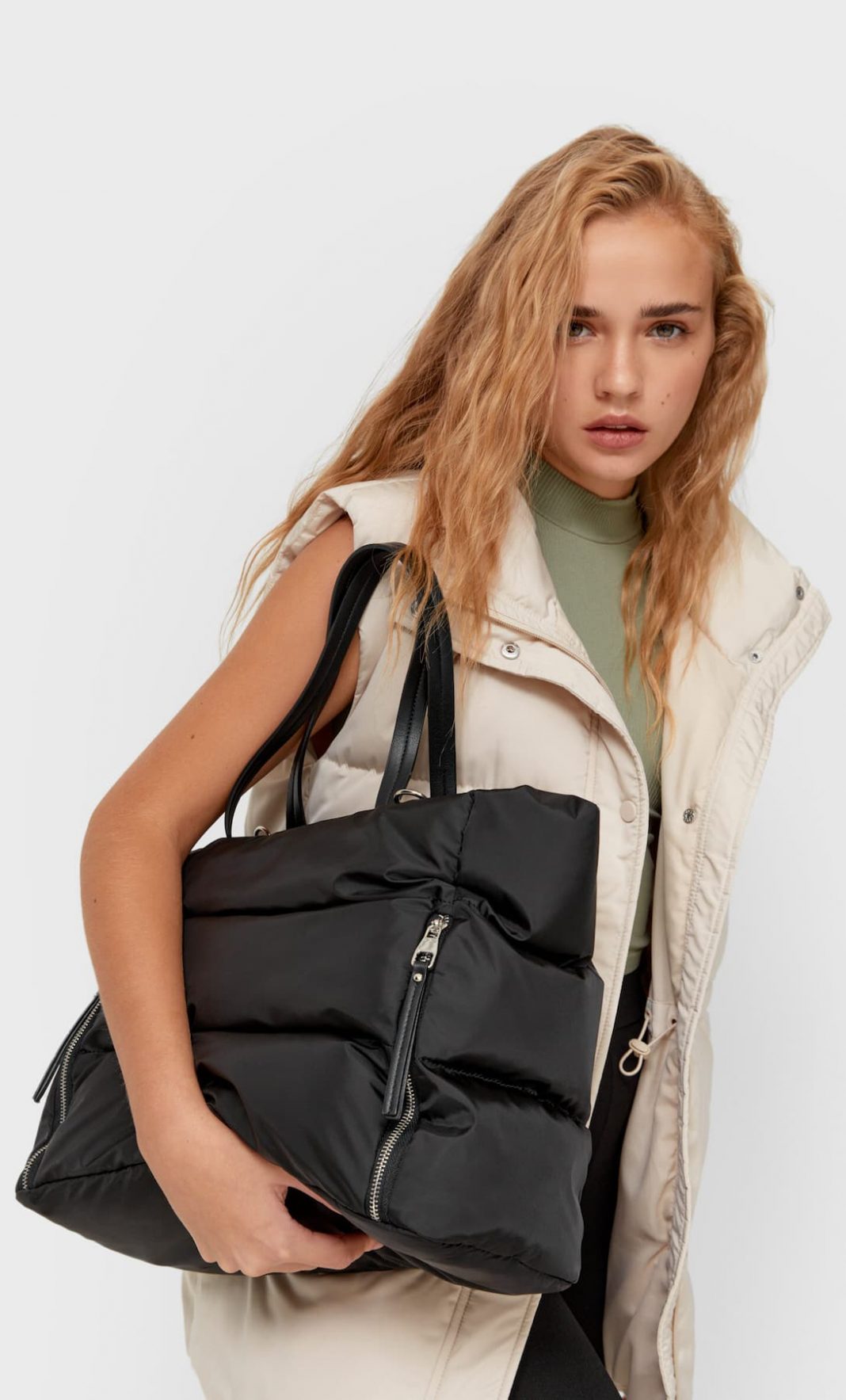 Otro de los bolsos shopper de Stradivarius que más llaman la atención por su comodidad y buen diseño es este. También acolchado, está disponible en un intenso tono negro, ideal para combinar con todo y adornado con detalles de cremalleras muy útiles. Disponible por solo 25,99 euros, lo querrás en casa.