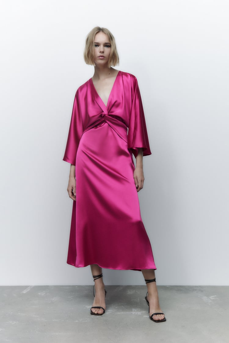 Si no eres de vestidos cortos, Zara también tiene una amplia oferta de vestidos largos y midi muy favorecedores y, como no, en color rosa fucsia. Este vestido de escote pico pronunciado y manga amplia con detalle de nudo delantero y cierre en la espalda es perfecto para una ocasión especial, especialmente para bodas y eventos. También está disponible en blanco y su precio es de 45,95 euros.