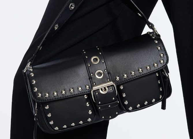 Algo más particular es la apariencia de este otro bolso de hombro con tachas de Stradivarius. Dicho lo cual, puede presumir de ser un modelo realmente atractivo, con un tono más rockero y rebelde, pero todavía apto para diferentes looks y estilos. A pesar de su imagen algo más “agresiva” funciona de maravilla con unos vaqueros o cualquier cosa similar. También para salir y tomar unas copas.