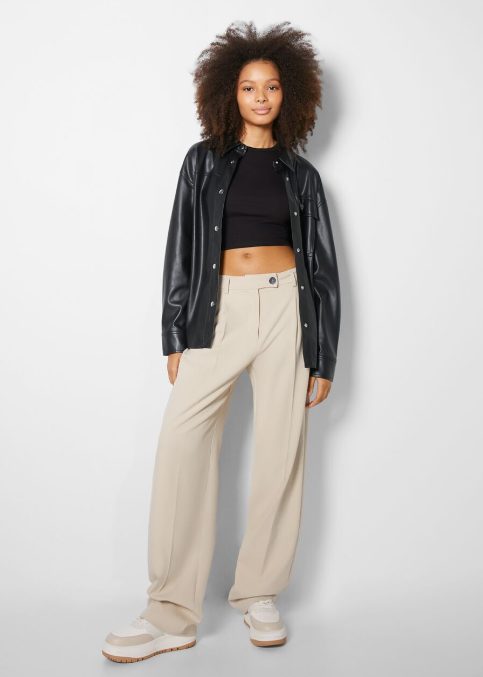 Para terminar la lista de las camisas del Bershka que serán tendencia este otoño y que, además, tienen un precio accesible para todos los públicos, tenemos esta camisa manga larga oversize efecto piel. Otra sobrecamisa que tiene en la colección la tienda y que sólo cuesta 29,99 euros, un precio muy competitivo y más sabiendo lo que nos ofrece. Tiene un tejido que recuerda a la piel, un cierre con botones, un diseño inspirado en las chaquetas de motoristas, pero con un corte oversize.