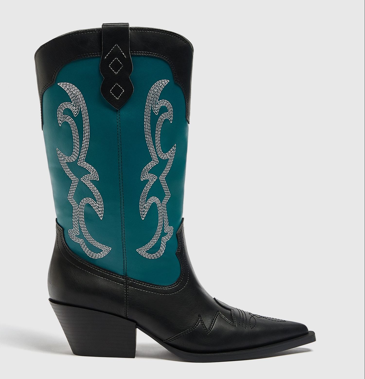 Sin duda, uno de los diseños que viene pisando fuerte de cara a la próxima temporada es el estilo cowboy. En Pull&Bear ya se han hecho eco del mismo a través de botas como estas, de diseño fantasía, perfectas para llamar la atención donde vayas. Con una gran combinación de tonos negros, azules y blancos, se convertirán en tus favoritas por tan solo 49,99 euros.