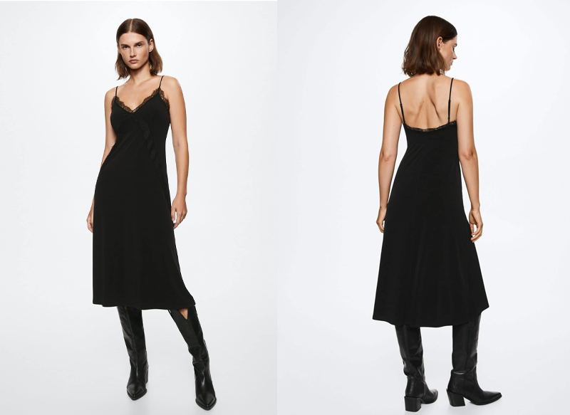 A la venta por 35,99 euros, es un vestido de color negro de tejido fluido y elástico que posee un diseño midi recto y detalle de encaje y blonda. Dispone de tirantes finos ajustables y está confeccionado en poliéster, elastano y poliamida.
