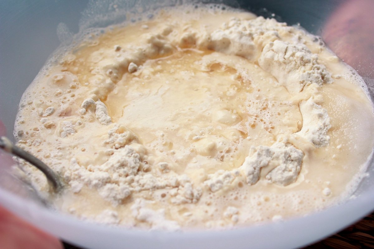 Desmenuzamos la levadura fresca en el agua tibia y removemos hasta que esté completamente diluida. En un recipiente hondo colocamos la harina y hacemos un hueco en el centro donde vertemos el agua con la levadura y el aceite de oliva. Con una cuchara de madera revolvemos los líquidos a medida que vamos incorporando harina poco a poco. Añadimos una cucharadita de sal (unos 5 g.) y seguimos mezclando. Cuando esté demasiado espesa para remover con la cuchara, trabajamos con las manos. Ponemos la masa en una superficie lisa y enharinada y amasamos unos minutos hasta que quede final, lisa y muy elástica. Hacemos una bola y dejamos reposar durante 1 hora en un recipiente hondo cubierta con un paño.