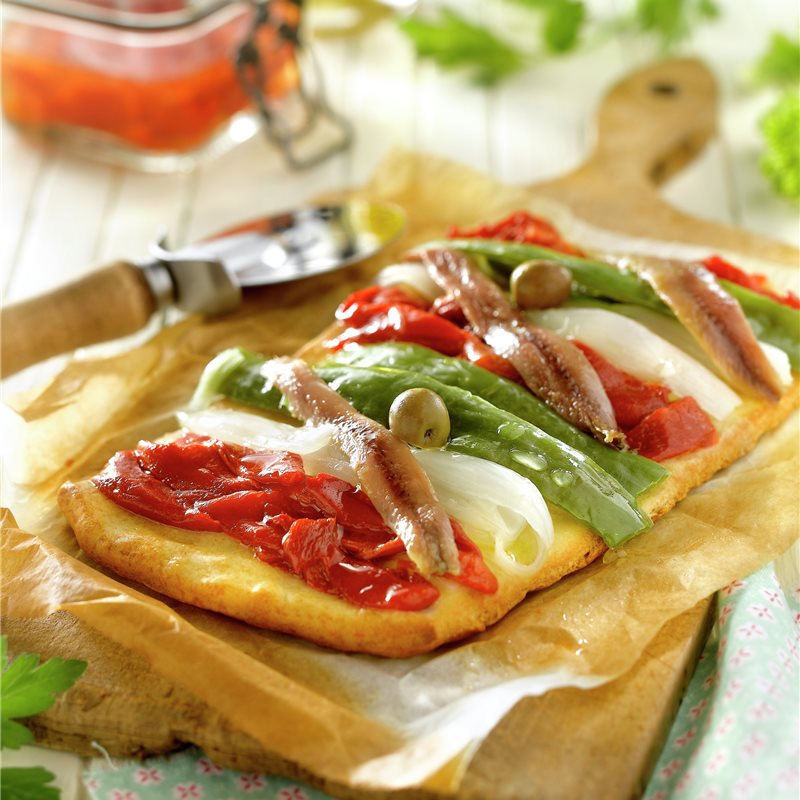 En una bandeja de horno engrasada o forrada con papel vegetal, extendemos la masa y la regamos con un chorro de aceite de oliva virgen. Después disponemos encima la cebolla, el pimiento, el calabacín y el pimiento rojo asado. Hay que ir salpimentando cada una de las capas de hortalizas que colocamos sobre la masa. Llevamos la cuenta al horno que hemos precalentado a 225ºC con calor arriba y abajo y dejamos hornear durante unos 20 minutos. Retiramos del horno, cortamos en porciones, y servimos calentita.