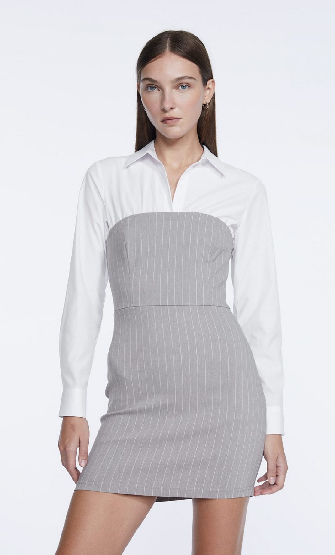 Existen un millón de combinaciones para esta monada teñida de gris con rayas blancas. De manga larga y cuello solapa, se torna el diseño perfecto para ir a la oficina a lucir silueta después del verano. Imagínatelo con un bolso maletín donde llevas el portátil. ¡Sencillamente encantador! Si todavía vas a clase, te dará un toque sensual e intelectual al mismo tiempo con el que te convertirás en la envidia de todo el centro académico.