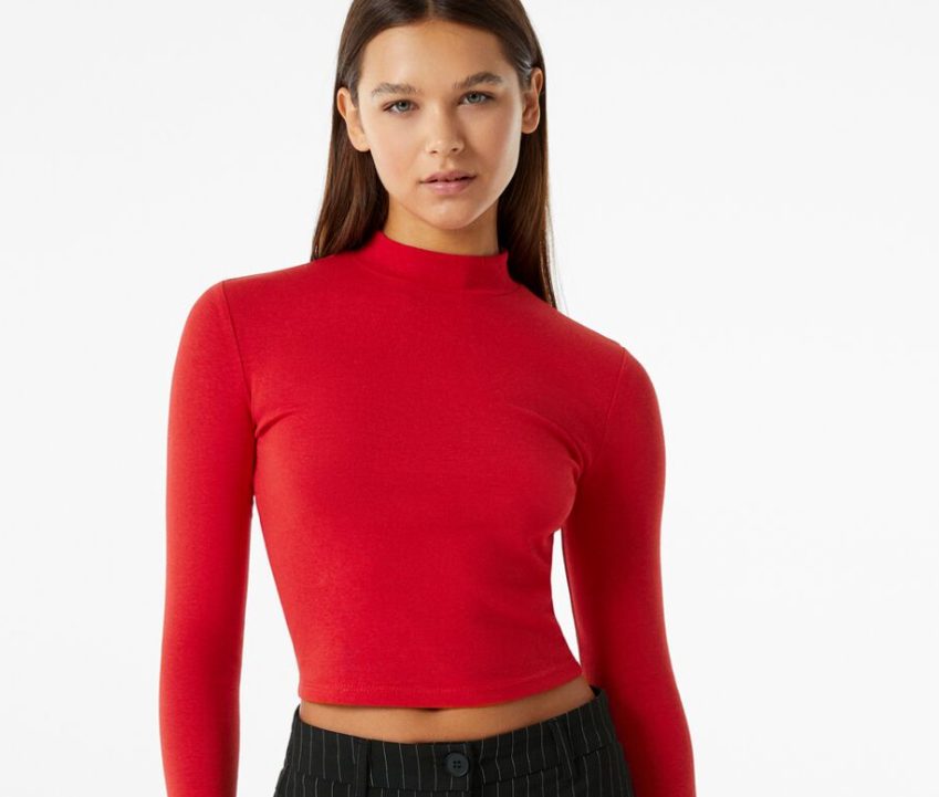 Por ejemplo, esta camiseta, que tiene manga larga y cuello alto, pero deja estéticamente el ombligo al aire. Esto, en un sentido práctico se puede traducir de una forma muy sencilla: perfecta para estos momentos del año en los que el frío todavía no aprieta demasiado, pero sí refresca, sobre todo en la mañana o la noche. Su precio es de 9.99 euros y también está en varios tonos.