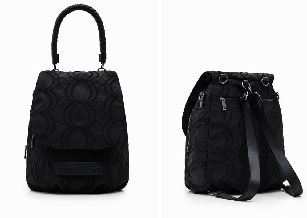 Otra de las mochilas que más llaman la atención dentro de la sección de novedades de Desigual es esta. Con un bonito diseño multiposición, la podrás usar con todas tus prendas gracias a su intenso tono negro. Además, cuenta con un ligero estampado de círculos que le aporta una gran personalidad. En cuanto a su precio, la puedes conseguir por 69,95 euros, por lo que es una buena oportunidad.