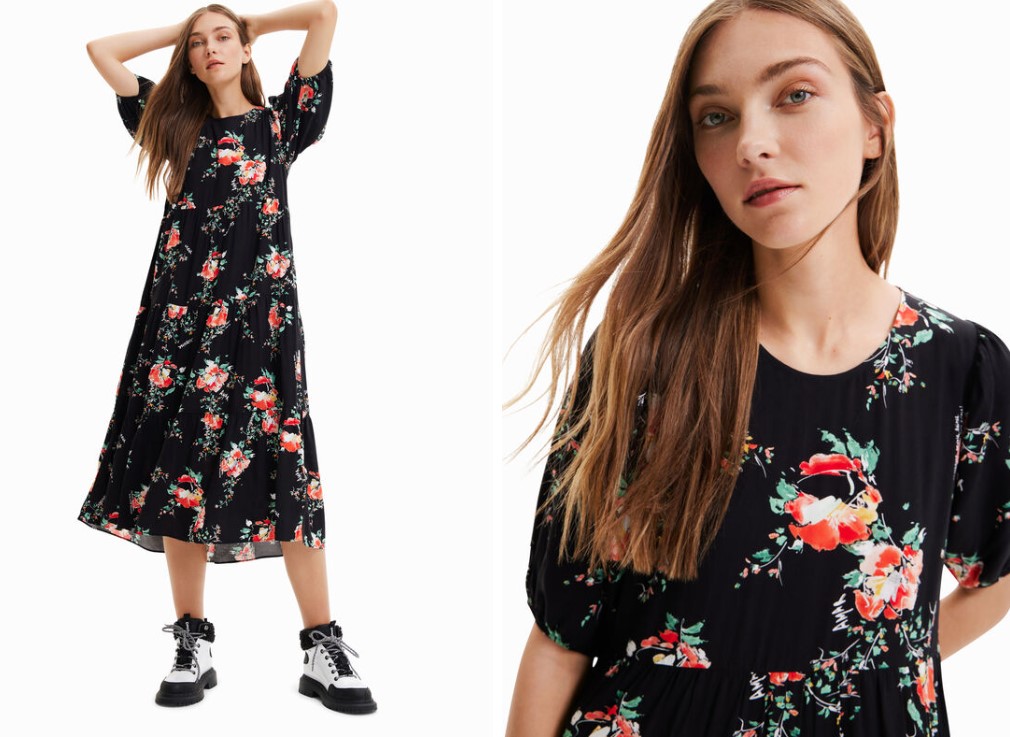 Si necesitas estrenar un vestido que te valga tanto para el día a día como para las ocasiones especiales, este de Desigual será tu mejor compañero. De diseño midi, base de color negro y bonitas flores como estampado, se convertirá en tu favorito. Además, te puedes hacer con él por 119 euros.