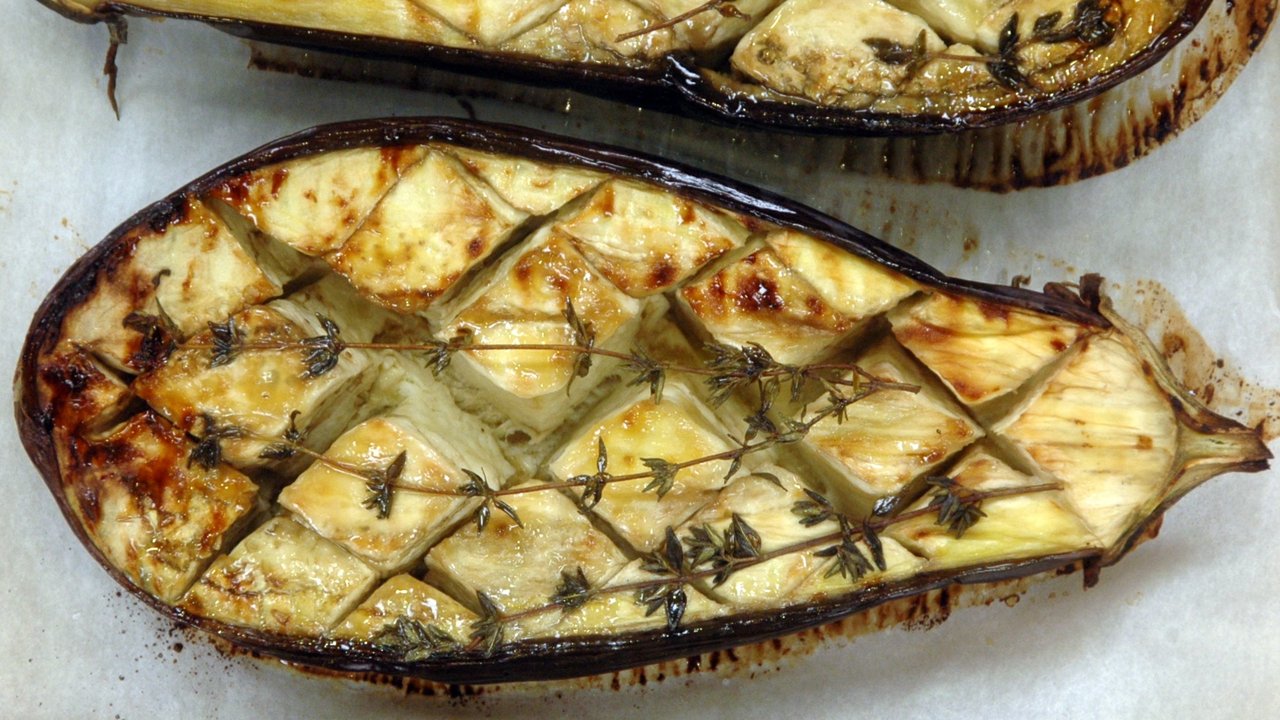 Empezamos cortando las berenjenas por la mitad, para después hacer unos cortes en forma de rejilla en la pulpa. Horneamos durante unos 40 o 45 minutos, o bien cocinamos en el microondas durante unos 7-8 minutos, hasta que la carne esté tierna. Mientras se preparan, pelamos las cebollas y las picamos finamente. En una sartén con una pizca de aceite de oliva, sofreímos la cebolla hasta que quede tierna y transparente, removiendo un poco de vez en cuando para que se haga por todas partes y no se queme.
