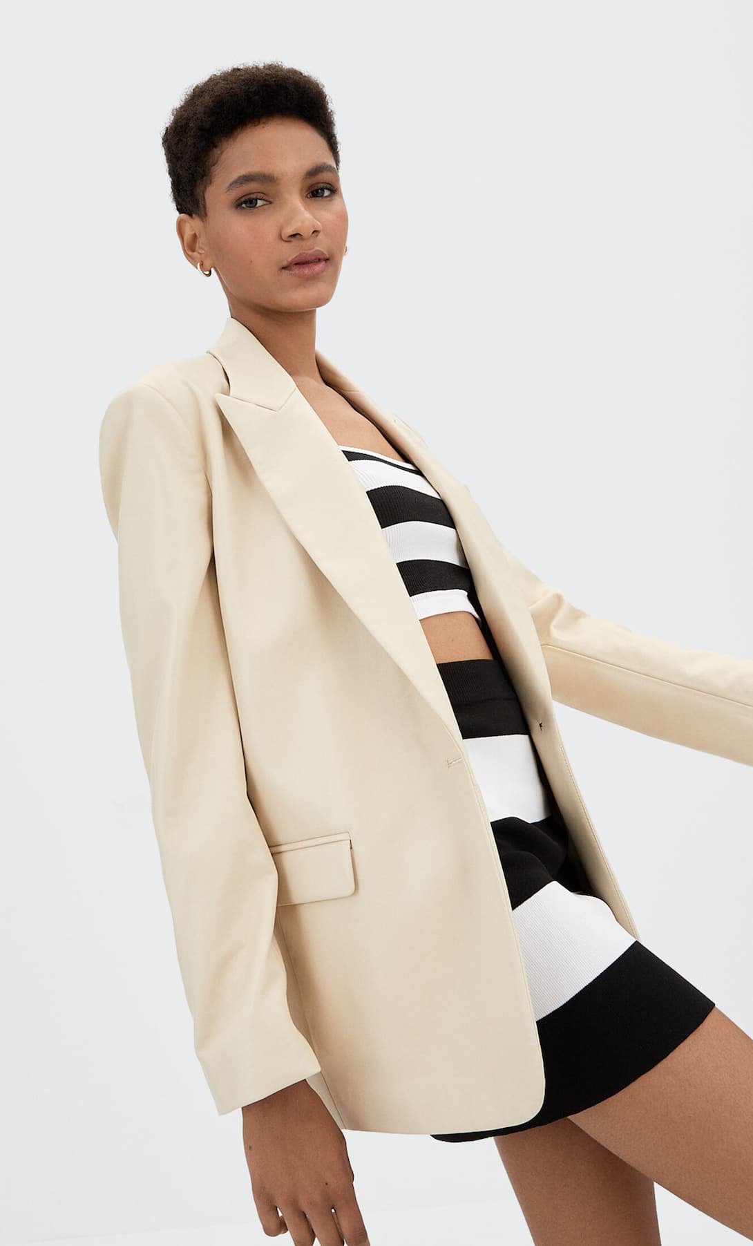 Una de las prendas que más llaman la atención de la sección de novedades de Stradivarius es esta americana. Desde la tienda se unen a la revolución del efecto piel, que estamos viendo en una gran variedad de propuestas, a través de esta chaqueta en color crudo, también disponible en negro, que podrás usar con todo. Por tan solo 35,99 euros, será una gran oportunidad.