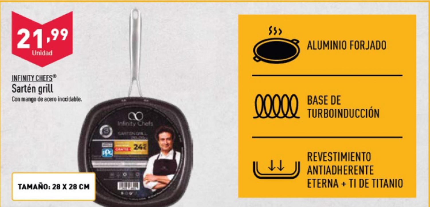 También de la gama “Infinity Chefs”, Aldi trae esta exquisita sartén grill Aldi que te facilitará la vida en un millón de sentidos. De aluminio forjado, base de turboinducción, revestimiento adherente y mango de acero inoxidable, definitivamente era el producto que necesitabas incluir en tu cocina. ¿Su precio? ¡De risa! 21,99 euros.