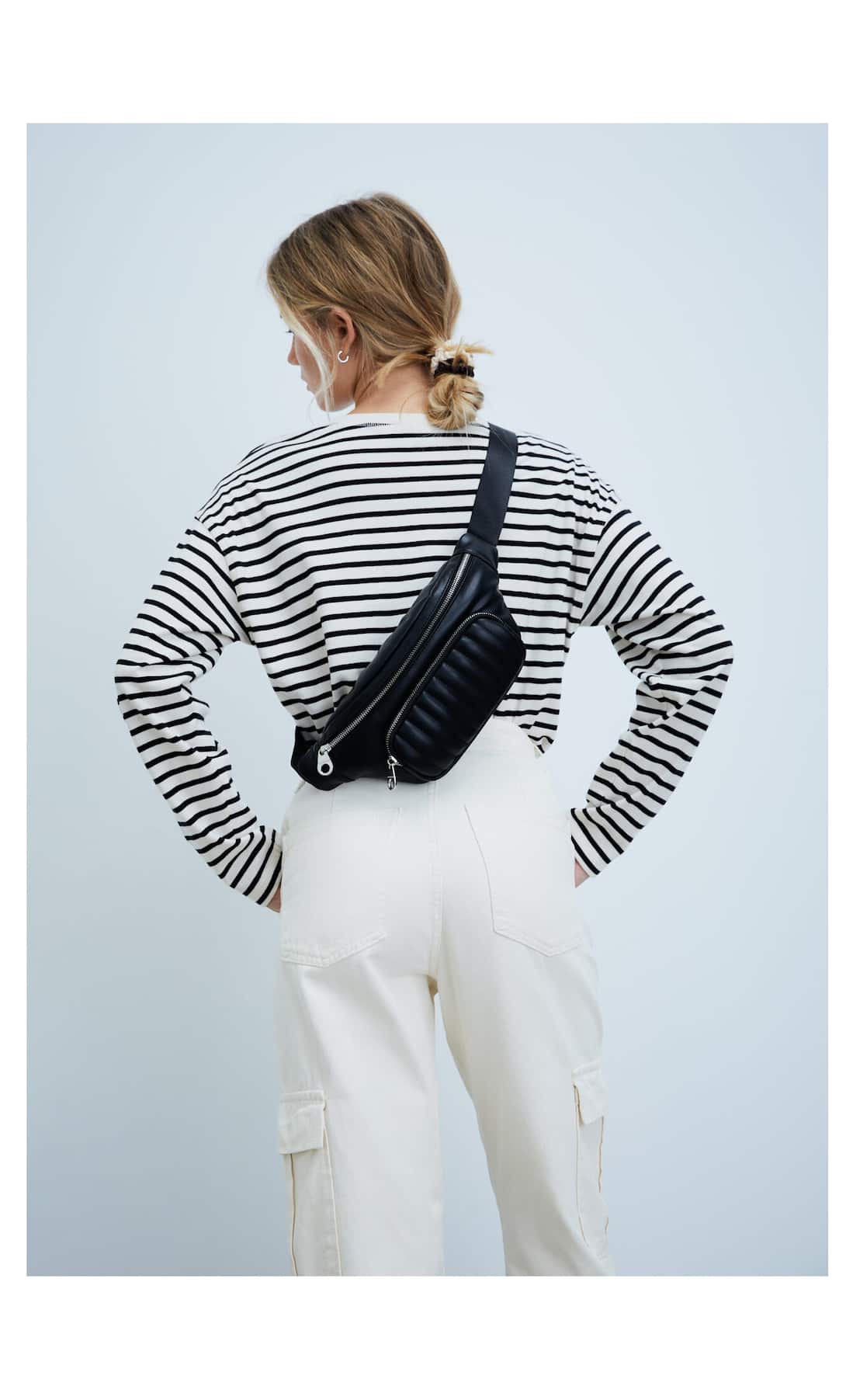 Pero no todo son prendas dentro de la sección de novedades de Stradivarius. Otra de las cosas que no querrás dejar pasar son los accesorios. En este caso, llama sin duda la atención esta riñonera negra donde podrás guardar todo lo que necesites. Cómoda y fácil de transportar, te puedes hacer con ella por tan solo 15,99 euros.