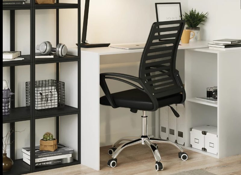 En todo escritorio es necesario disponer de un buen lugar en el que sentarse, y en Leroy Merlin puedes encontrar ahora esta silla escritorio Emma por 66,99 euros. De color negro, es un modelo de fácil montaje y limpieza que posee respaldo transpirable y reposabrazos fijos.