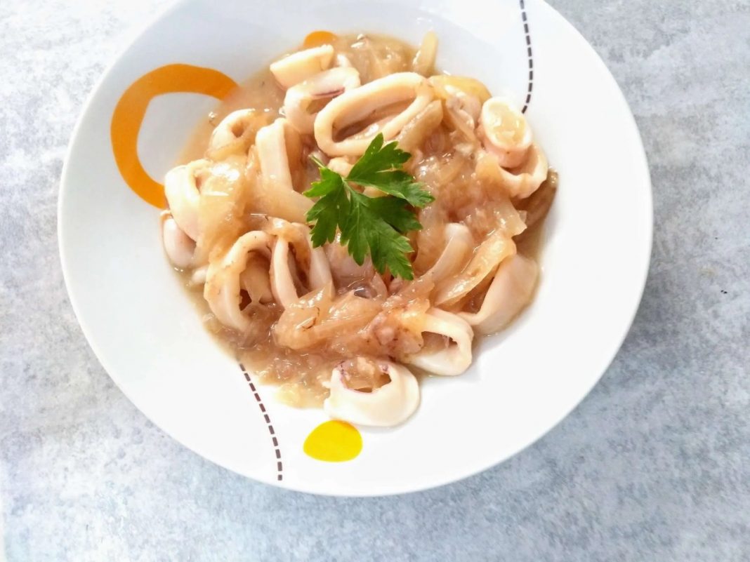 El proceso de elaboración de calamares encebollados que te presentamos en esta oportunidad es para 4 comensales. Si desearas crear este exquisito manjar para más personas, tendrías únicamente que adecuar las cantidades que aquí te proponemos. Vamos allá. Un kilo de calamares congelados limpios y cortados. También puedes comprar el kilo de calamares solo y limpiarlos y cortarlos tú, pero estamos poniéndonos en el contexto de que tengas poco tiempo. 4 cebollas, de vino blanco, aceite y sal. Cuando ya tengas todos estos componentes preparados, llega el momento de la acción.