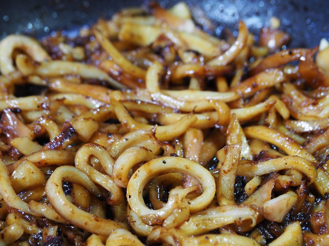 Hecho esto, pon el fuego al máximo y remueve dando vueltas durante 5 minutos. Añade vino blanco para aumentar el sabor, y déjalo otros 5 minutos a fuego intenso. Cerciórate de que la cebolla y los calamares no se peguen a la sartén mientras el alcohol del vino se va evaporando. Una vez realizados todos estos pasos, retira los ingredientes del fuego. Pruébalos para ver si te gusta el sabor y aumenta la sal si lo crees necesario.