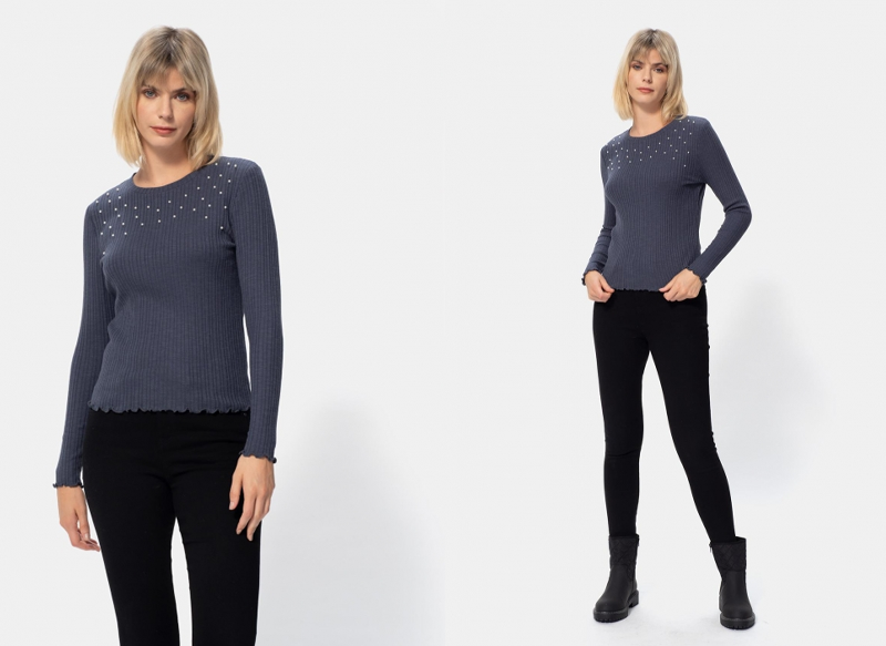 Disponible por separado por 12,99 euros, se trata de una camiseta que está a la venta en tallas desde la XS a la 3XL que es de manga larga y de tipo canalé con detalle de perlas incrustadas en el tejido para darle un acabado más interesante. Se encuentra confeccionada en una mezcla de algodón, poliéster, viscosa y elastano.