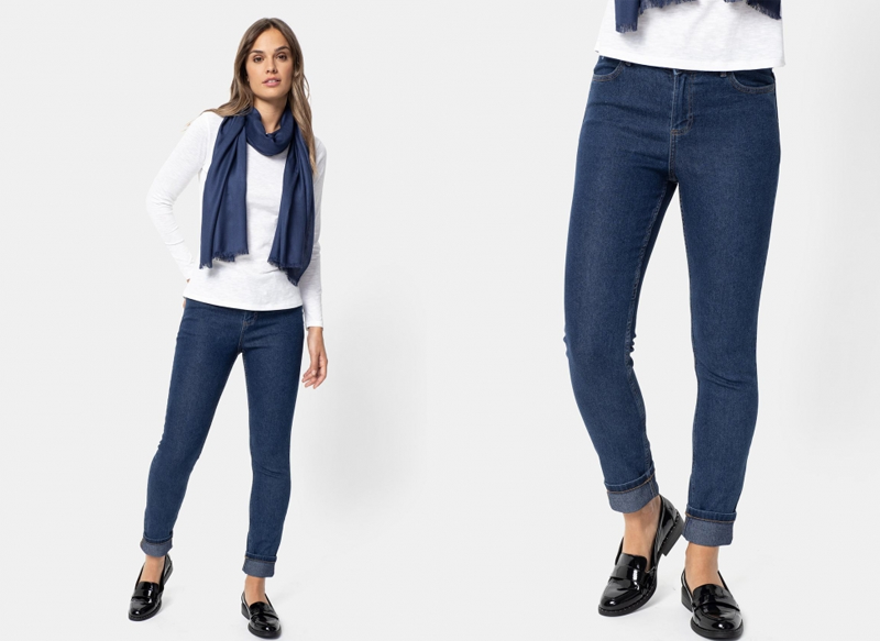 Este pantalón vaquero slim sostenible para mujer de la marca TEX de Carrefour está disponible, entre otros colores, en azul marino oscuro. Es una prenda ideal para combinar con infinidad de prendas superiores gracias a su versatilidad, algo propio de este tipo de prendas vaqueras.