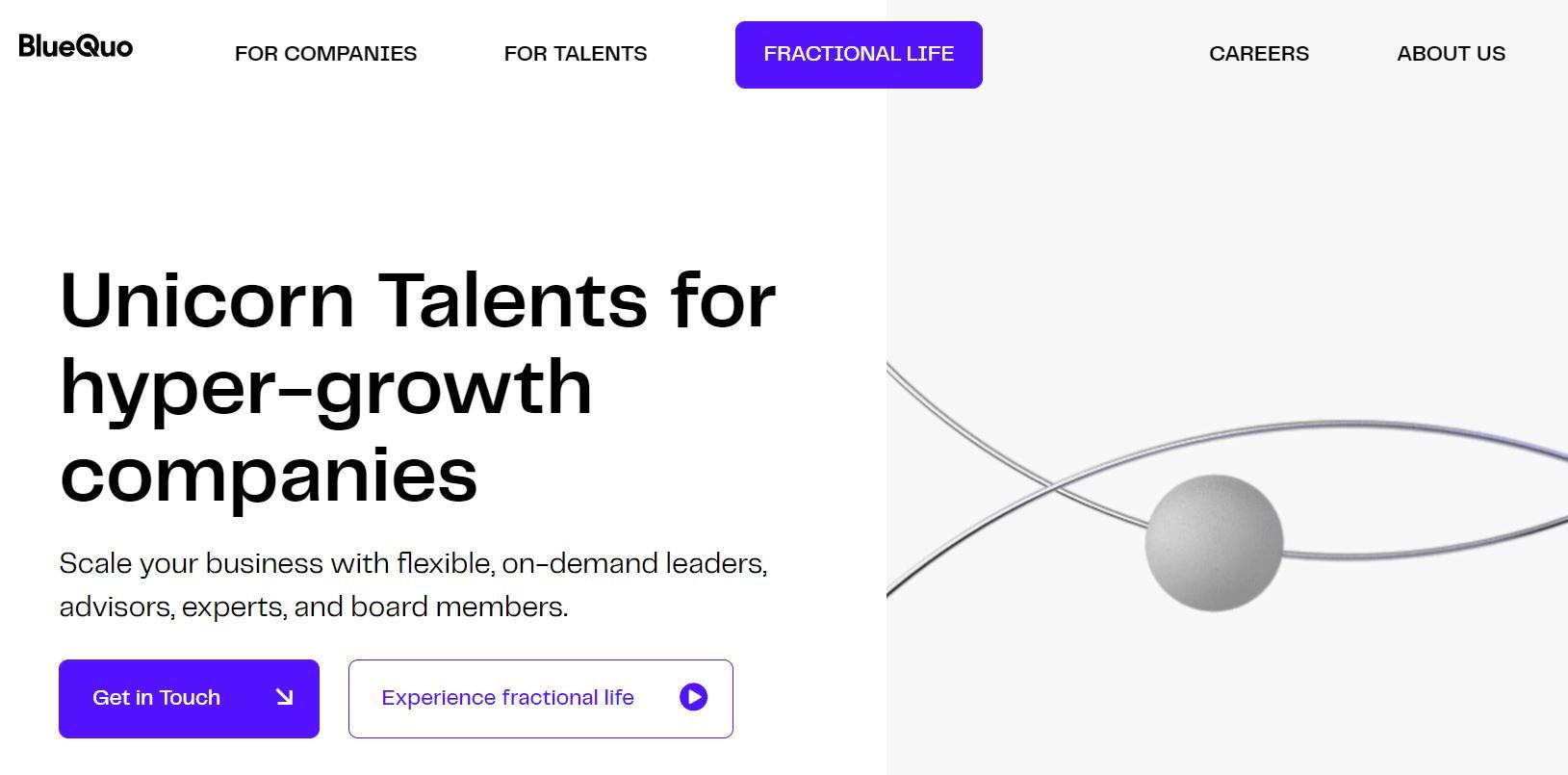 Es una startup global que ofrece una solución para la modalidad laboral fractional, conectando fácilmente a las startups de alto crecimiento y a los C-levels con una solución integral, desde la búsqueda del candidato y el puesto, hasta la gestión del rendimiento, que permite a ambas partes crecer y desarrollarse eficazmente. https://bluequo.com