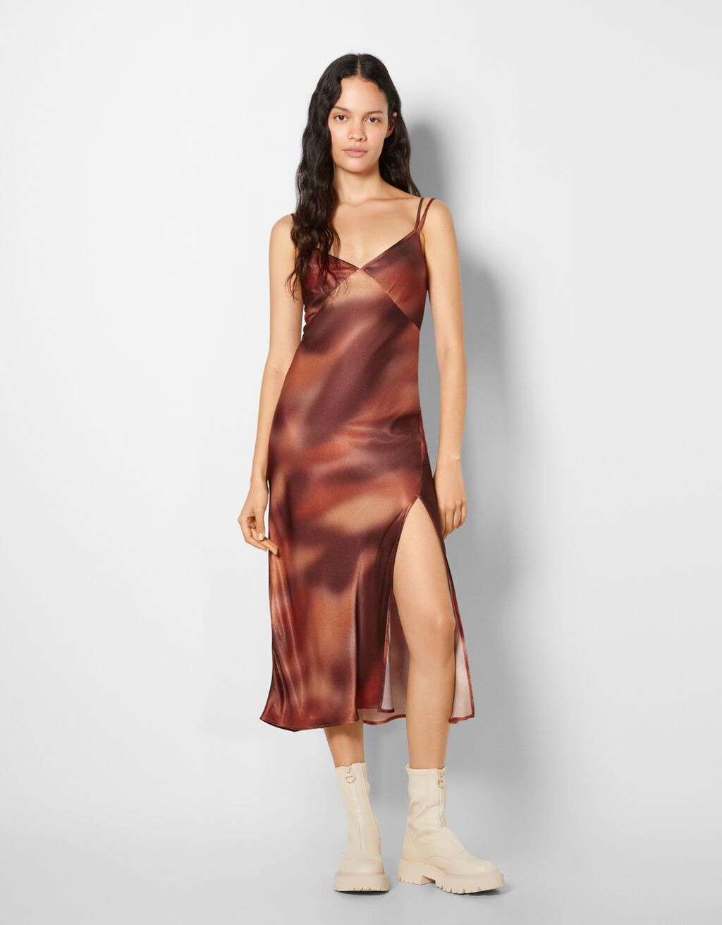 Elegancia. Si tuviéramos que definir con una palabra a este vestido sería esa, además de glamour y presencia. No es una prenda que podamos usar de diario, pero sí que podemos guardarla para una ocasión especial. El vestido midi tirante doble satinado está disponible en la página web y en las tiendas físicas de Bershka por el módico precio de 25,99 euros. ¿Qué tiene de especial esta pieza? Principalmente su tejido compuesto de viscosa, además de su doble tirante, su bajo con abertura y su diseño ceñido para marcar curvas.