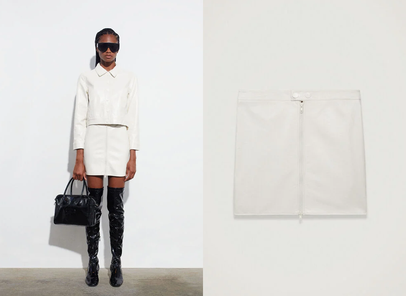 A la venta por 29,99 euros, es una falda corta de tiro alta que está disponible en blanco, burdeos y negro, y que cuenta con un cierre delantero con botones y cremallera. Dispone de una abertura lateral.