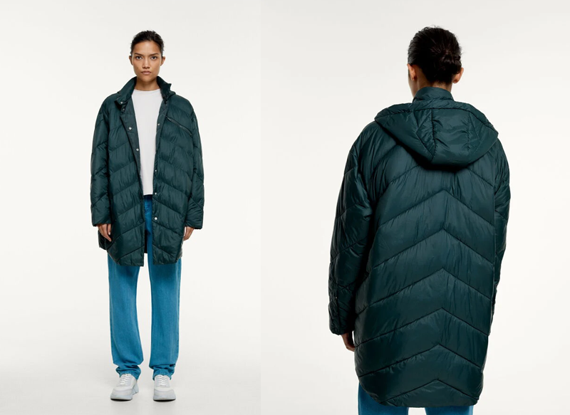A la venta por 59,99 euros y disponible tanto en azul como en verde, es un abrigo de cuello alto con capucha y manga larga. Dispone de un cierre delantero con botones y bolsillos delantero con cremallera. Se encuentra a la venta en talla única.