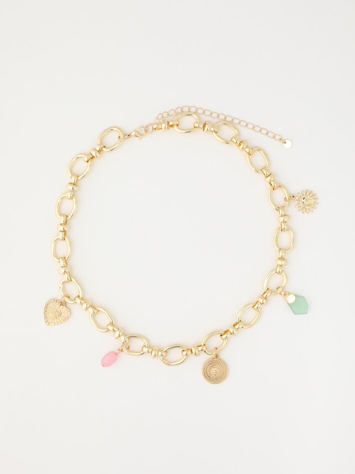 Este collar de Lefties en color dorado con abalorios combinados y cadena gruesa de estilo gargantilla es el accesorio perfecto para arreglar cualquier look y darle un toque elegante. Su color oro está tan bien conseguido que nadie notará la diferencia. Su precio es de tan solo 5,99 euros. El material está compuesto principalmente por hierro, aunque también tiene un porcentaje de zinc y plástico acrílico. Con un buen cuidado y sin exponerlo al agua directamente conseguirás mantenerlo en perfecto estado. A continuación te mostramos otros accesorios increíbles.