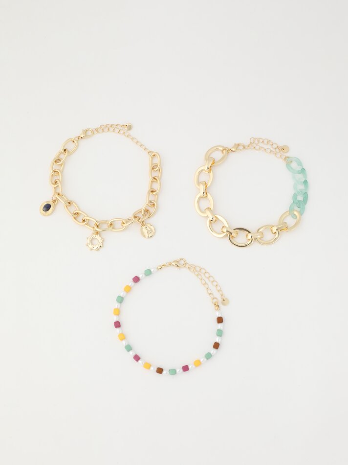 Otro de los mejores accesorios que puedes encontrar en Lefties y que, además, combina a la perfección con en anterior, es este pack de tres pulseras combinadas en diferentes formas y colores. Puedes usarlas juntas o por separado, y nadie notará que son de bisutería. Su exterior está hecho de hierro, zinc y plástico acrílico. Lo mejor es que puedes conseguir las tres por solo 5,99 euros.