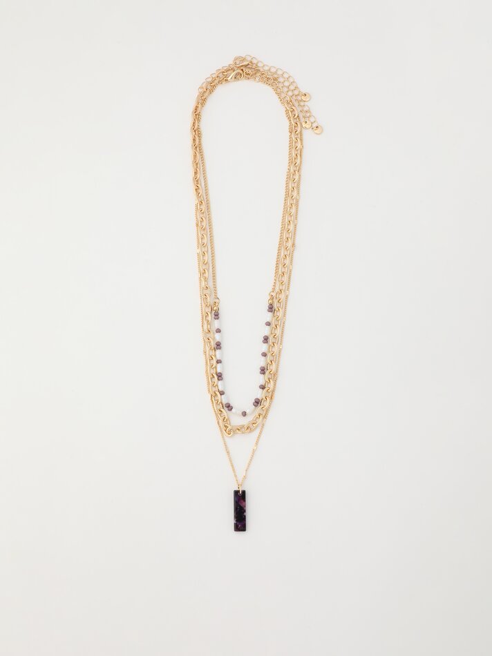 De entre todos los collares que puedes encontrar en Lefties, este pack de tres collares dorados de distintas formas combinados con abalorios morados es una de las mejores opciones. Puedes utilizarlos todos juntos o ir escogiendo las piezas por separado como más te gusten. Su composición está hecha a base de hierro, plástico-acrílico, zinc, poliéster y latón. Lo mejor para mantener su brillo y su color dorado intactos es no exponerlos al agua. Pueden ser tuyos por tan solo 5,99 euros.