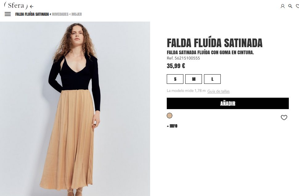 Es una prenda hermosa que no deben de dejar pasar en esta temporada. Además, es una hermosa falda satinada fluida con goma en cintura. Por lo que, es perfecta de usar en cualquier temporada del año, por el estilo que ofrece. Inclusive, si desean comprar esta hermosa prenda solo tienen que entrar a Sfera por un precio accesible de 35,99 €.