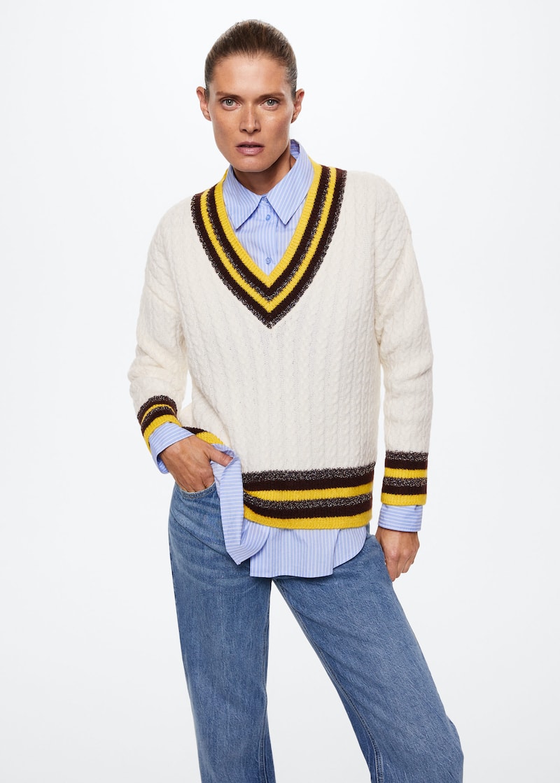 De entre todas las prendas que podemos encontrar en la sección de novedades de Mango, otra de las más buscadas es este jersey de lúrex y cuello en pico. Llama la atención gracias a su detalle de banda en color amarillo, pues consigue captar miradas. Cómodo y fácil de llevar, lo puedes conseguir además por 39,99 euros.