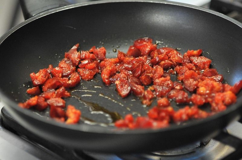 Cuando tengas todos los ingredientes preparados, puedes comenzar a cocinar tu «paella» particular. Para ello, trocea tanto la cebolla como el pimiento rojo. Después, corta en rodajas el chorizo. Para aprovecharlo al máximo, corta las puntas en trozos pequeños. Ahora, agrega en una olla el chorizo y dóralo sin agregar aceite, pues se cocinará con su propia grasa.