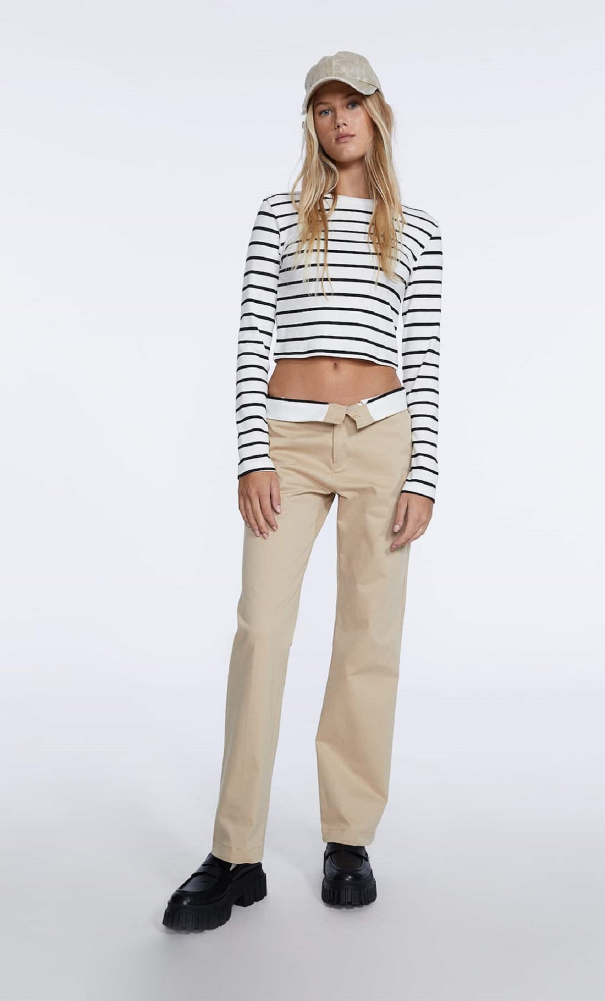 Esta camiseta de cuello redondo y manga larga a rayas es el básico que nunca pasa de moda. Encima tiene un puntito de lo más atractivo con la barriga al descubierto. O sea que, vayas donde vayas, nadie podrá evitar darse cuenta de que estás ahí. Además, pega casi con cualquier cosa. Pantalones o faldas de color negro, blanco o vaquero. Si utilizas esta camiseta de Stradivarius en invierno, podrás sacarle muchísimo más partido creando ‘looks’ más completos con chaqueta incluida. Una prenda que utilizarás por añares por el módico precio de 9,99 euros.