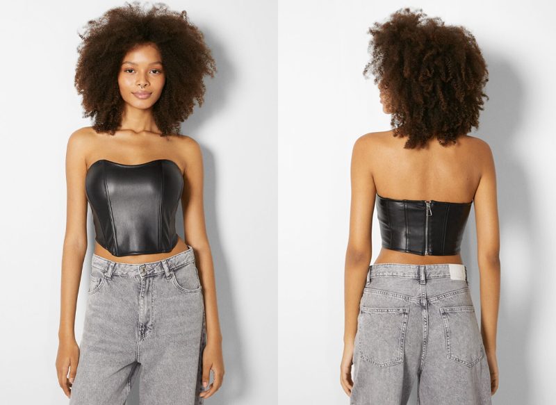 Este top corsé efecto piel de la marca perteneciente al grupo Inditex es otra de nuestras recomendaciones por menos de 20 euros. Este modelo está disponible tanto en color negro como en crudo y azul.