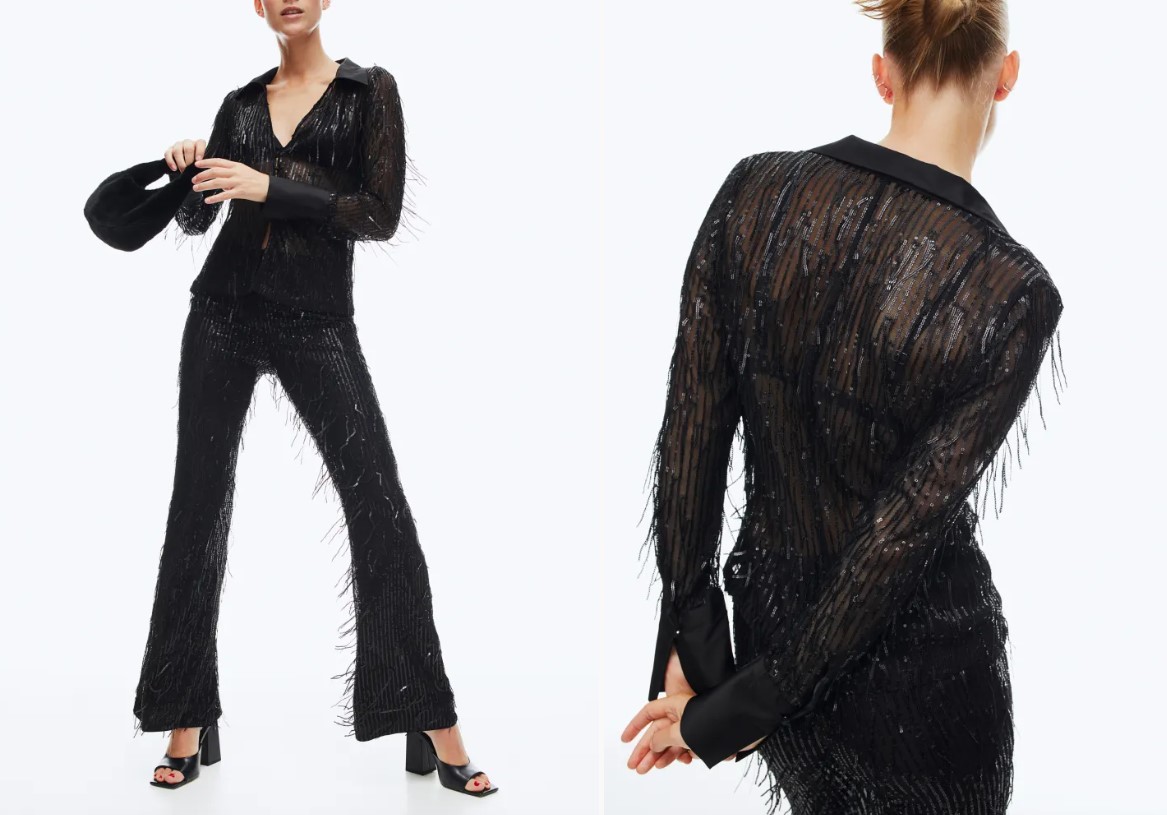 Comenzamos con la primera opción que es la camisa de lentejuela en color negro. El diseño es entallado, en malla revestida de lentejuelas y con flecos. Este modelo presenta cuello de pico, escote en V y botones revestidos delante. Es manga larga y los puños son anchos con botón revestido y abertura. No posee forro. Disponible en las tallas que van desde el XS al XXL y el precio de venta es de 29,99 euros.