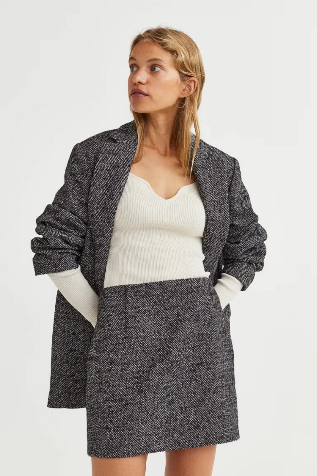 Seguimos en la misma línea. Es posible ir abrigada y elegante con una minifalda, sobre todo en este caso. H&M ha confeccionado esta prenda pensando en aquellas a las que les gusta ir arregladas en su día a día y no solo cuando salen por la noche. Es más, lucen ideales con unos tacones stiletto estilo ejecutiva 100%. De hecho, esta minifalda queda magnífica con unas buenas botas altas y un abrigo largo. El contraste entre el largo el abrigo y el corto de la falda no tiene comparación alguna. Cuesta 29,99 euros y la tienes disponible en varias tonalidades: gris con estampado de espiguilla, crema con cuadros, gris oscuro con cuadros, negro, color crema con cuadros.