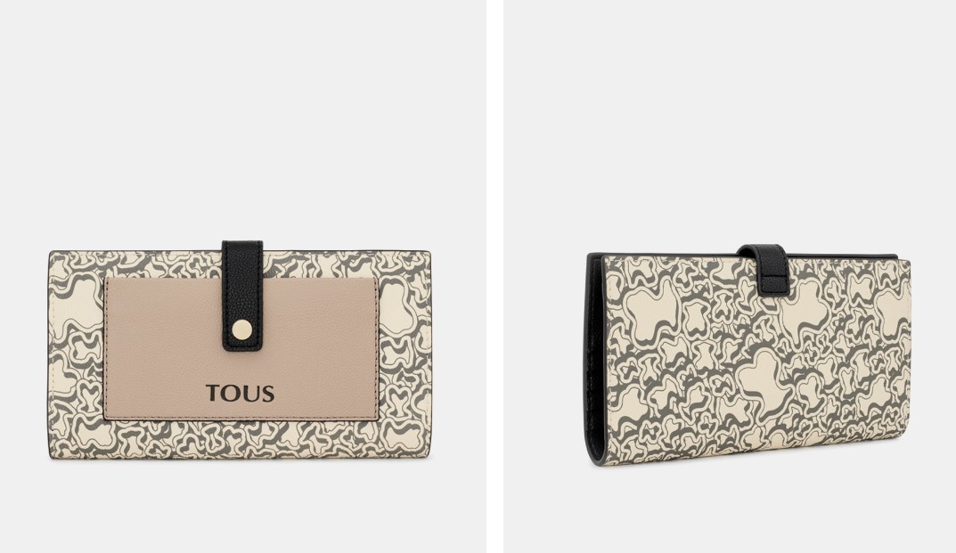 Se trata de una billetera grande Pocket Tous muy elegante, de la colección Kaos Mini Evolution. Es de lona en color beige con detalles de piel sintética y tiene un cierre con botón a presión. Cuenta con un bolsillo tarjetero en la parte de delante y en el interior contiene dos espacios divididos por un bolsillo con cierre cremallera con compartimento para tarjetas y bolsillo abierto. Medidas (alto x ancho x fondo): 11,4 x 19,7 x 2,5 cm. El precio de venta es de 99 euros.