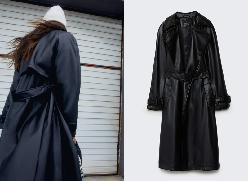Otra de las prendas de abrigo que tenemos que destacar de Stradivarius es este trench largo efecto piel, que en su caso está disponible en color negro en tallas XS a XL. Su precio de venta es de 49,99 euros.