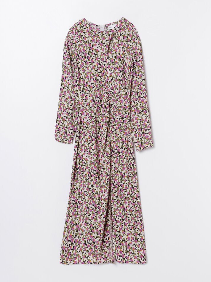 Otra de las opciones más bonitas y favorecedor que puedes encontrar en la colección de otoño invierno de Lefties es este vestido de largo midi con cuello redondo y manga larga con aberturas en la parte interior y bajo el cuello que le dan un toque moderno. Tiene cierre de cremallera invisible en la espalda y fruncido en la parte delantera y está confeccionado en un tejido muy fluido. Combina a la perfección con unos botines en color crudo y es perfecto tanto para usar a diario como para una ocasión especial. Su precio es de 19,99 euros.