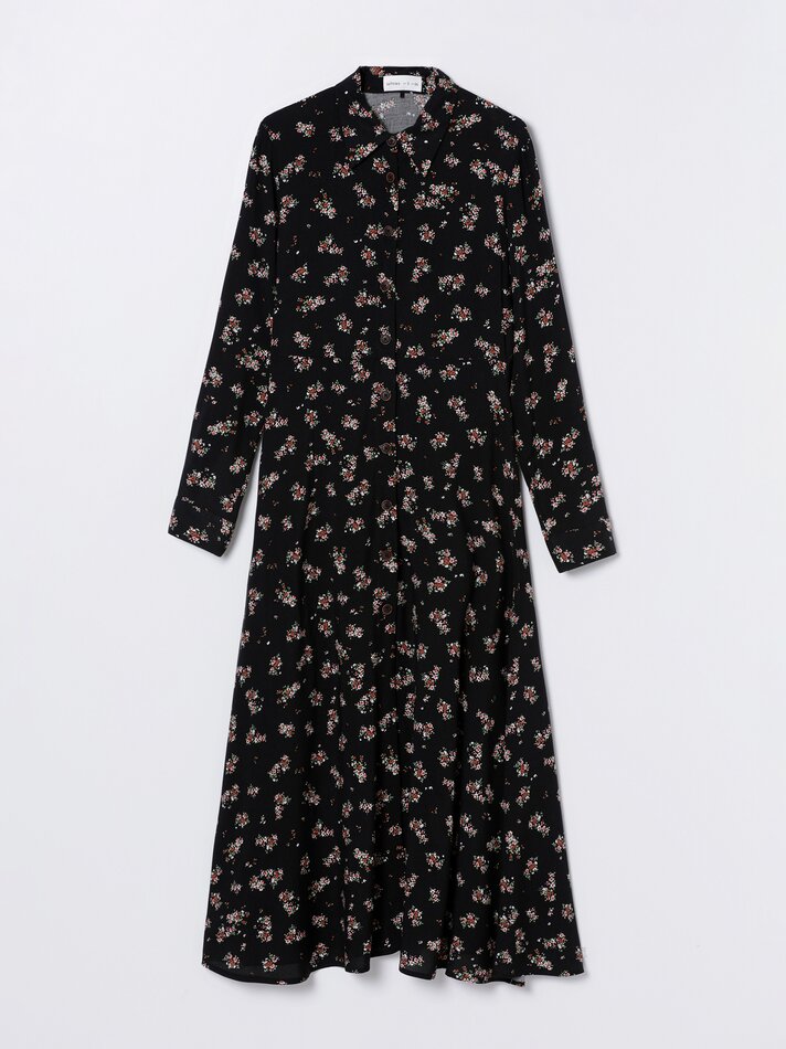 Otra de las grandes opciones de vestidos que puedes encontrar en Lefties es este vestido camisero largo de manga larga con estampado de flores y confeccionado en un tejido fluido muy cómodo. Es una opción genial para los días de más frío combinado con unas botas de tacón o los botines que más te gusten. Está disponible en tres colores con tres estampados diferentes y su precio es de 17,99 euros.