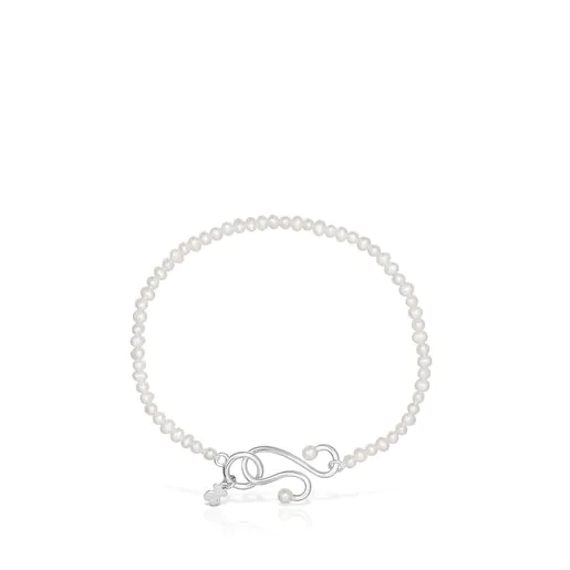 Entre las novedades de Tous se encuentra la fantástica colección llama Tsuri, que combina una serie de joyas preciosas de plata y pequeñas perlas cultivadas. Una de las piezas más llamativas es la pulsera, hecha de plata de primera ley, con dos brillantes y bonitas perlas cultivadas, de un tamaño entre 3-3,5 mm. La longitud de la pulsera abierta es de 19 cm y tiene un cómodo cierre de gancho. Tiene un precio de 129 € y se puede pagar en tres mensualidades de 43 €.