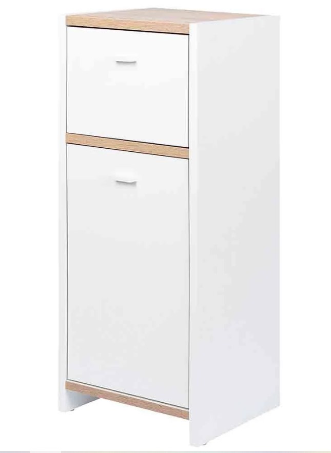 Seguidos mostrándote muebles de Lidl que pueden ir bien para el cuarto de baño. Este es un mueble auxiliar para baño con un cajón, puerta y dos prácticos estantes. Se trata de un diseño en acabado blanco mate con tono roble. Es resistente a los arañazos y fácil de limpiar gracias al revestimiento de resina de melamina. Viene con protectores para no dañar el suelo. Las medidas aproximadas son 80x28x32 cm (largo, fondo, ancho) y el precio de venta es de 29,99 euros.