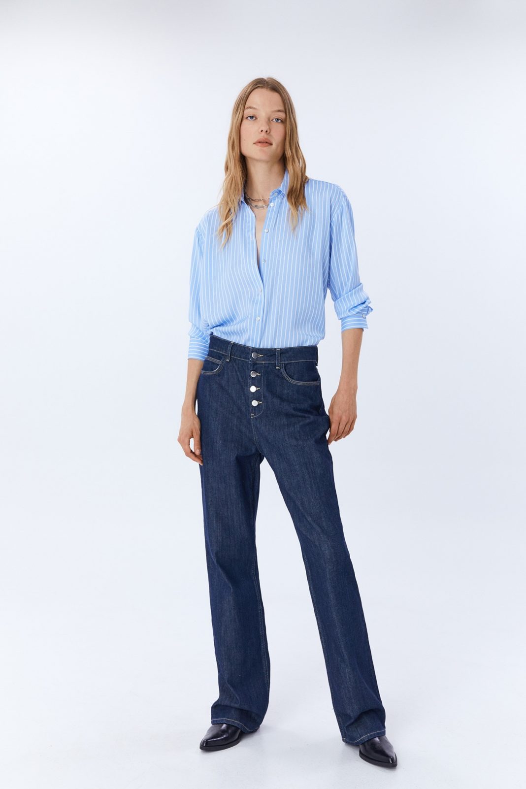Otras de las tendencias que vuelve, pero esta vez más recatada son las rayas. Sfera trae dentro de sus creaciones de otoño esta camisa satinada estampada que no puede quedar mejor al cuerpo. No es tremendamente pegada, pero tampoco se convierte en camisola. Con rayas ‘beige’ y celestes, puedes crear ‘looks’ ideales para ir a la ofi sin ir demasiado arreglada. Combinando con unos vaqueros o pantalones cómodos, puedes lucir desenfadada sin necesidad de acudir a desarregladas camisetas. La modelo lleva varios botones desabrochados, hacer esto o no dependerá de cómo sea el ambiente de tu lugar de trabajo. Esta camisa es más barata que las anteriores: 17,99 euros.
